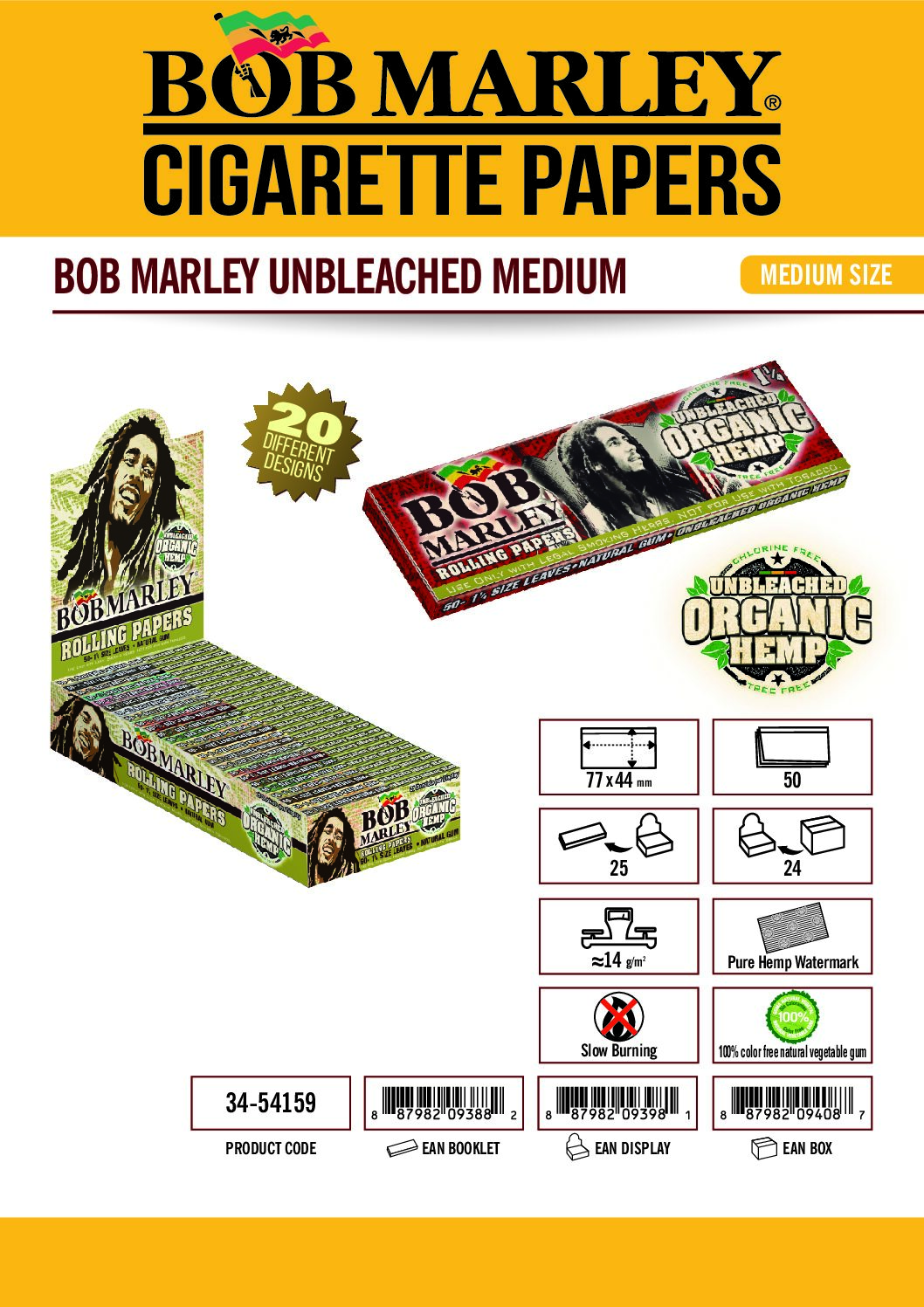 1 Display of 50 Booklets Bob Marley 1.25 Organic Hemp Rolling Papers